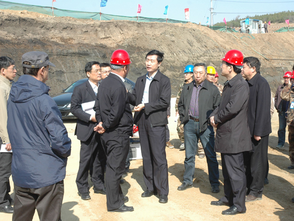 中部引水工程是一项系统工程,由干线工程和二期工程组成供水网络。在冯家岭分水枢纽工程工地,隋忠诚询问施工单位吉林省水利水电工程局施工情况,并详细了解供水主干线施工情况。